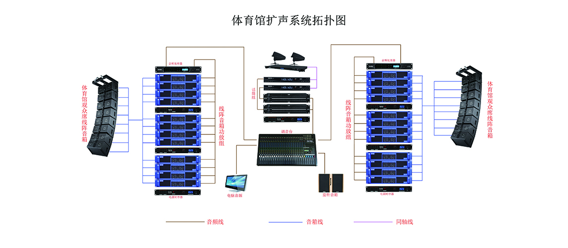 體育館主比賽場地擴聲擴聲系統的設計,包括比賽場地的擴聲系統,觀眾席的擴聲系統,主席臺監聽系統,擴聲控制室監聽系統,流動擴聲系統等可以獨立使用的子系統。